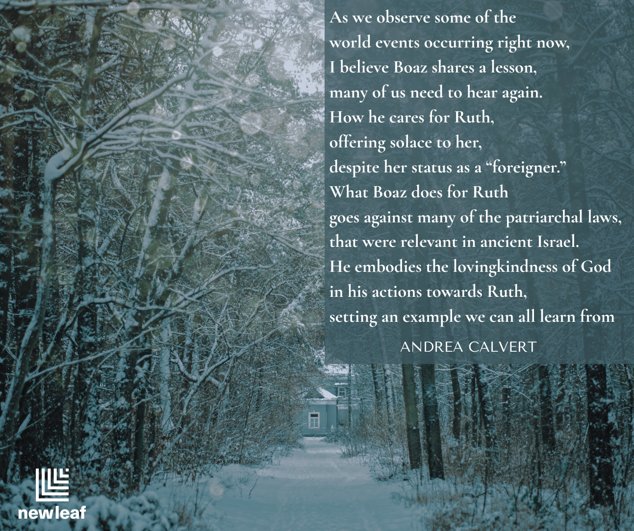 As we observe some of the world events occurring right now, I believe Boaz shares a lesson many of us need to hear again. How he cares for Ruth, offering solace to her despite her status as a “foreigner.” What Boaz does for Ruth goes against many of the patriarchal laws that were relevant in ancient Israel. He embodies the lovingkindness of God in his actions towards Ruth, setting an example we can all learn from.